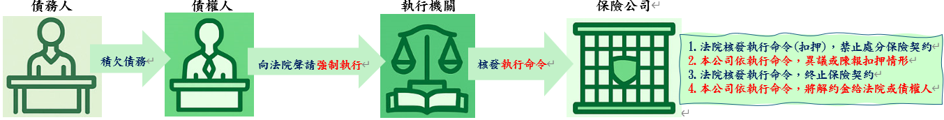 1.保險契約一旦被執行機關扣押後,僅有執行機關(各執行法院、行政執行署)有權撤銷命令,故債務人欲主張任何權利,例如:否認對債權人負有債務或已經清償等,應遵循法律程序向原執行機關聲明異議或提出異議之訴。
